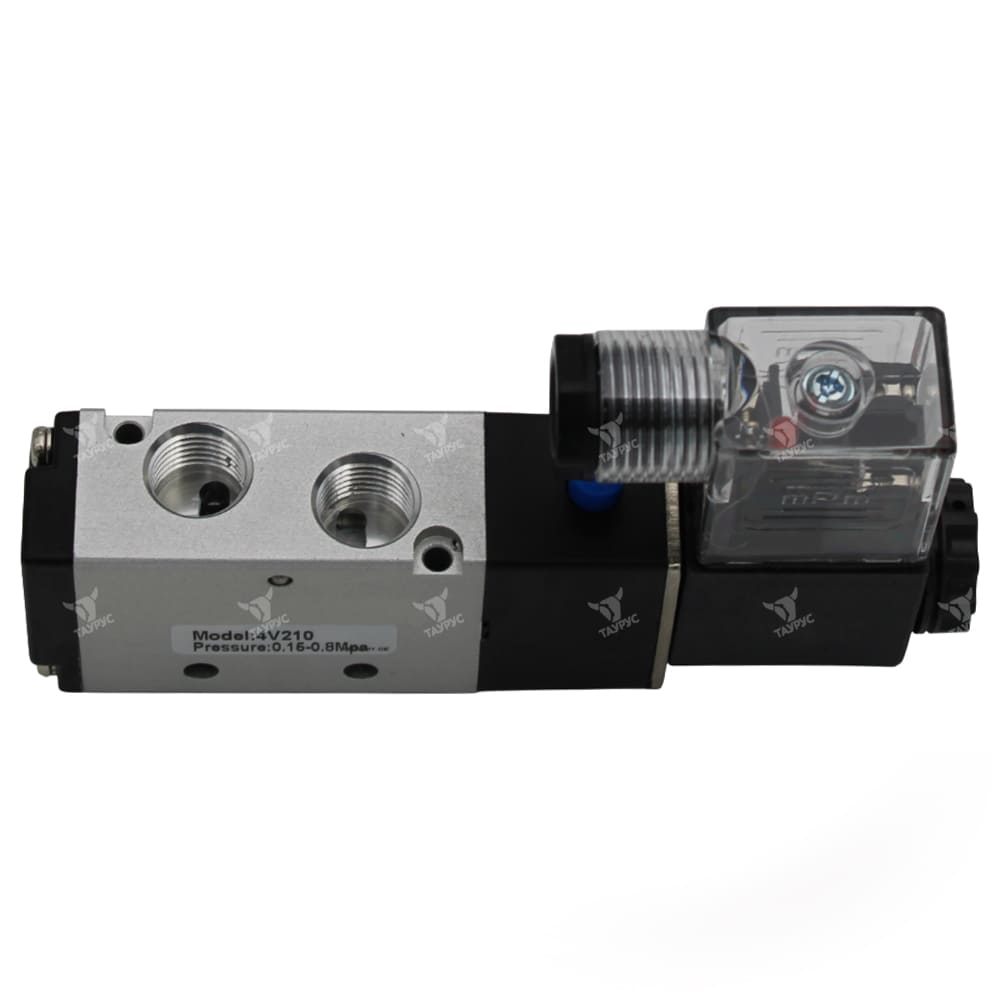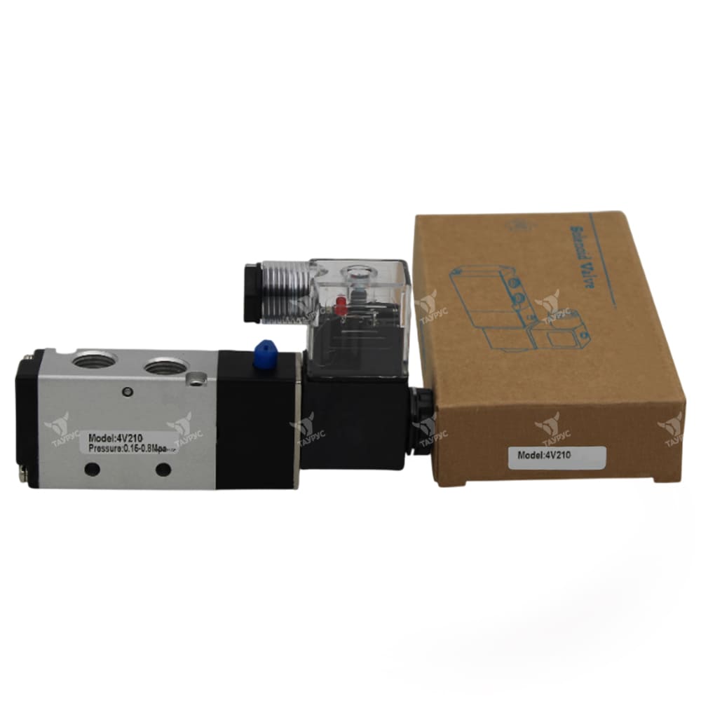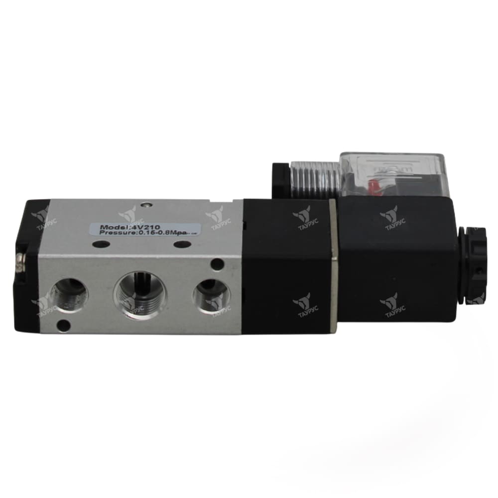 Пневмораспределители 4V210-08 DC24V являются 5-линейными двухпозиционными (5/2) пневматическими распределителями с односторонним электропневматическим управлением, номинальным напряжением 24В постоянного тока, присоединением 1/4" и пружинным возвратом золотника в исходное положение. Данные клапаны применяются в различного рода пневматическим приводах и служат для управления направлением потоков рабочей среды пневмосистемы (сжатый воздух), её пуском и остановом.Управление потоками воздуха осуществляется за счёт перемещения в корпусе пневмораспределителя золотника, форма которого зависит от габарита и схемы распределения. Золотник, в зависимости от своего положения в корпусе, перекрывает или открывает доступ сжатого воздуха по внутренним каналам пневмораспределителя в ту или иную линию.