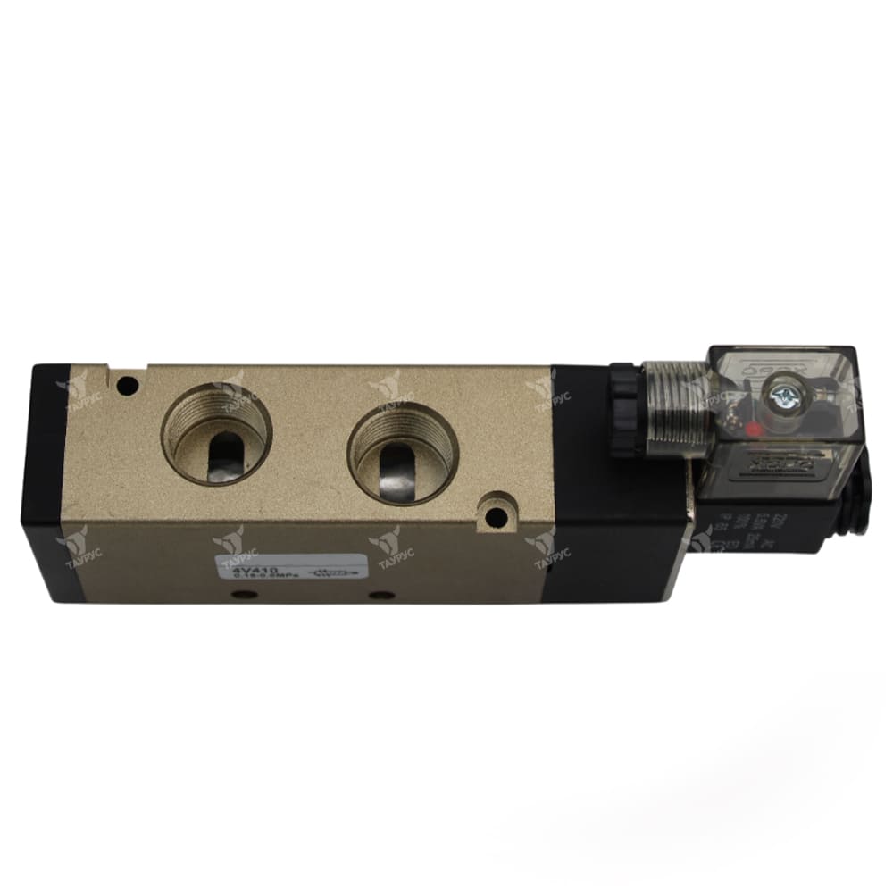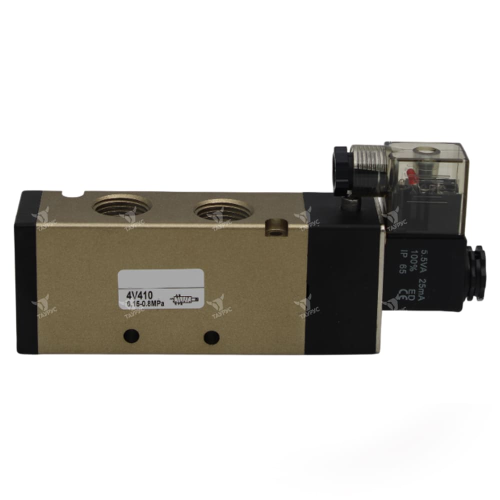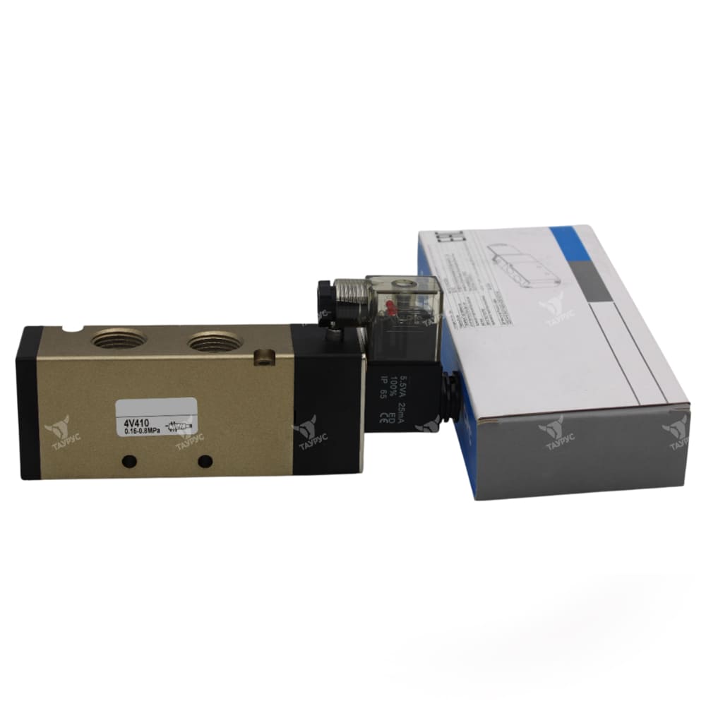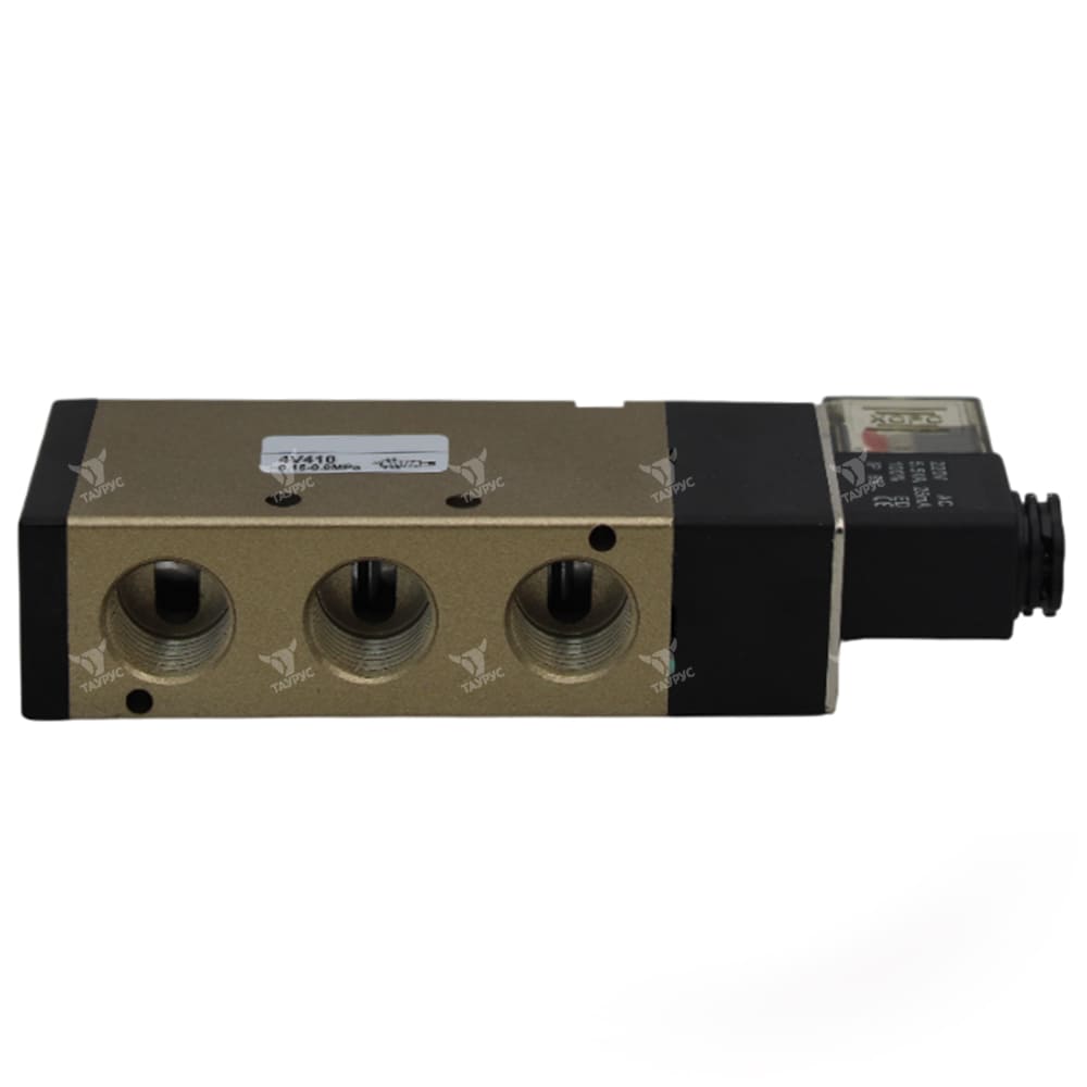Пневмораспределители 4V410-15 DC24V являются 5-линейными двухпозиционными (5/2) пневматическими распределителями с односторонним электропневматическим управлением, номинальным напряжением 24В постоянного тока, присоединением 1/2" и пружинным возвратом золотника в исходное положение. Данные клапаны применяются в различного рода пневматическим приводах и служат для управления направлением потоков рабочей среды пневмосистемы (сжатый воздух), её пуском и остановом.Управление потоками воздуха осуществляется за счёт перемещения в корпусе пневмораспределителя золотника, форма которого зависит от габарита и схемы распределения. Золотник, в зависимости от своего положения в корпусе, перекрывает или открывает доступ сжатого воздуха по внутренним каналам пневмораспределителя в ту или иную линию.