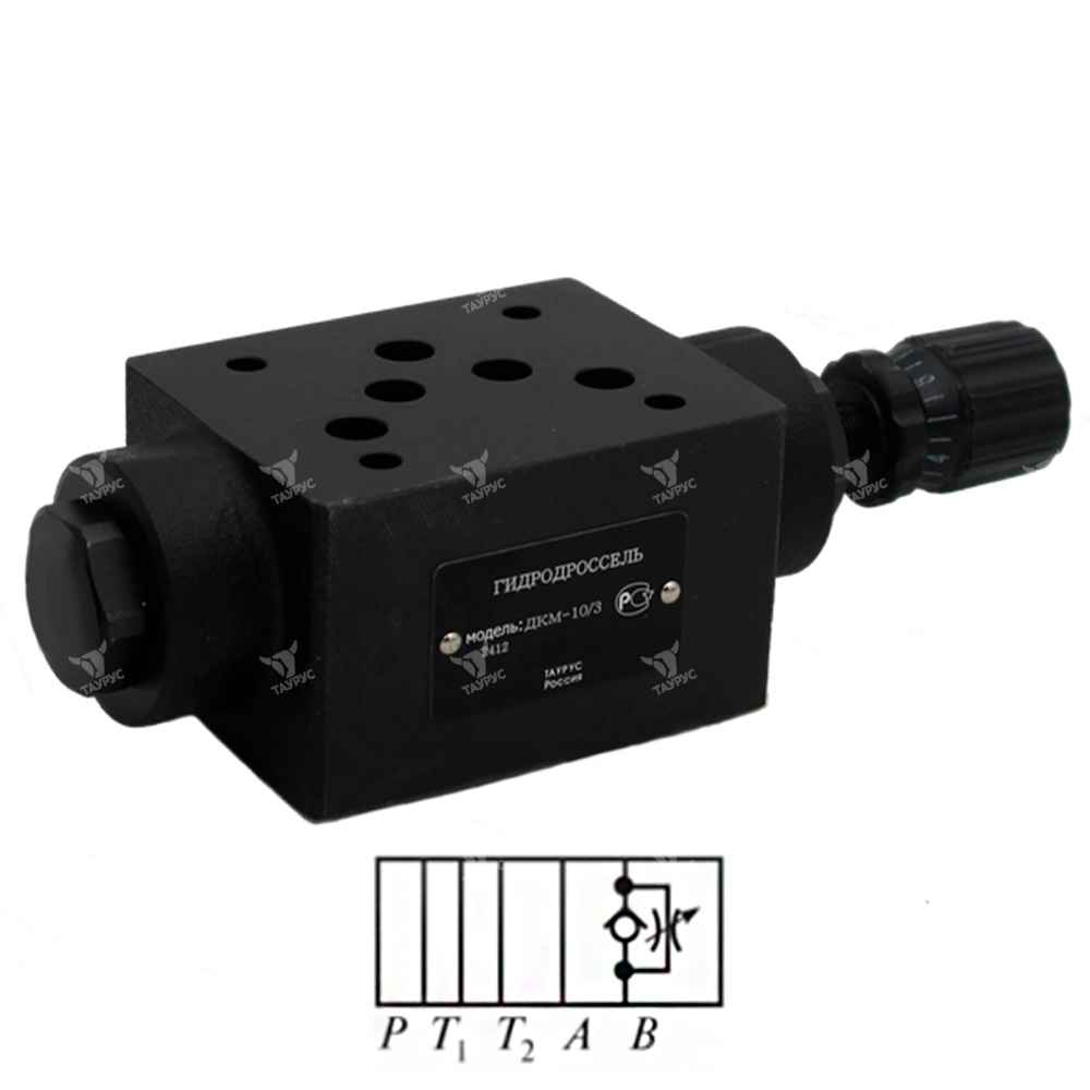 Гидродроссель с обратным клапаном ДКМ-10/3МВ с условным проходом Ду=10, номинальным давлением на входе 32 МПа обычно входит в комплекс модульной гидроаппаратуры и предназначен для создания перепада давлений между подводимым и отводимым потоками рабочей жидкости или регулирования величины расхода при прохождении потока рабочей жидкости в одном направлении и пропускании потока при прохождении его в обратном направлении в гидросистемах станков, прессов и других машин. В исполнении ДКМ 10/3 МВ дроссель установлен в линии В.