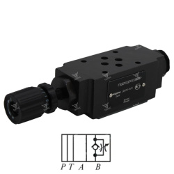 Гидродроссель с обратным клапаном ДКМ-6/3В с условным проходом Ду=6, номинальным давлением на входе 32 МПа обычно входит в комплекс модульной гидроаппаратуры и предназначен для создания перепада давлений между подводимым и отводимым потоками рабочей жидкости или регулирования величины расхода при прохождении потока рабочей жидкости в одном направлении и пропускании потока при прохождении его в обратном направлении в гидросистемах станков, прессов и других машин. В исполнении ДКМ-6/3В дроссель установлен в линии В.