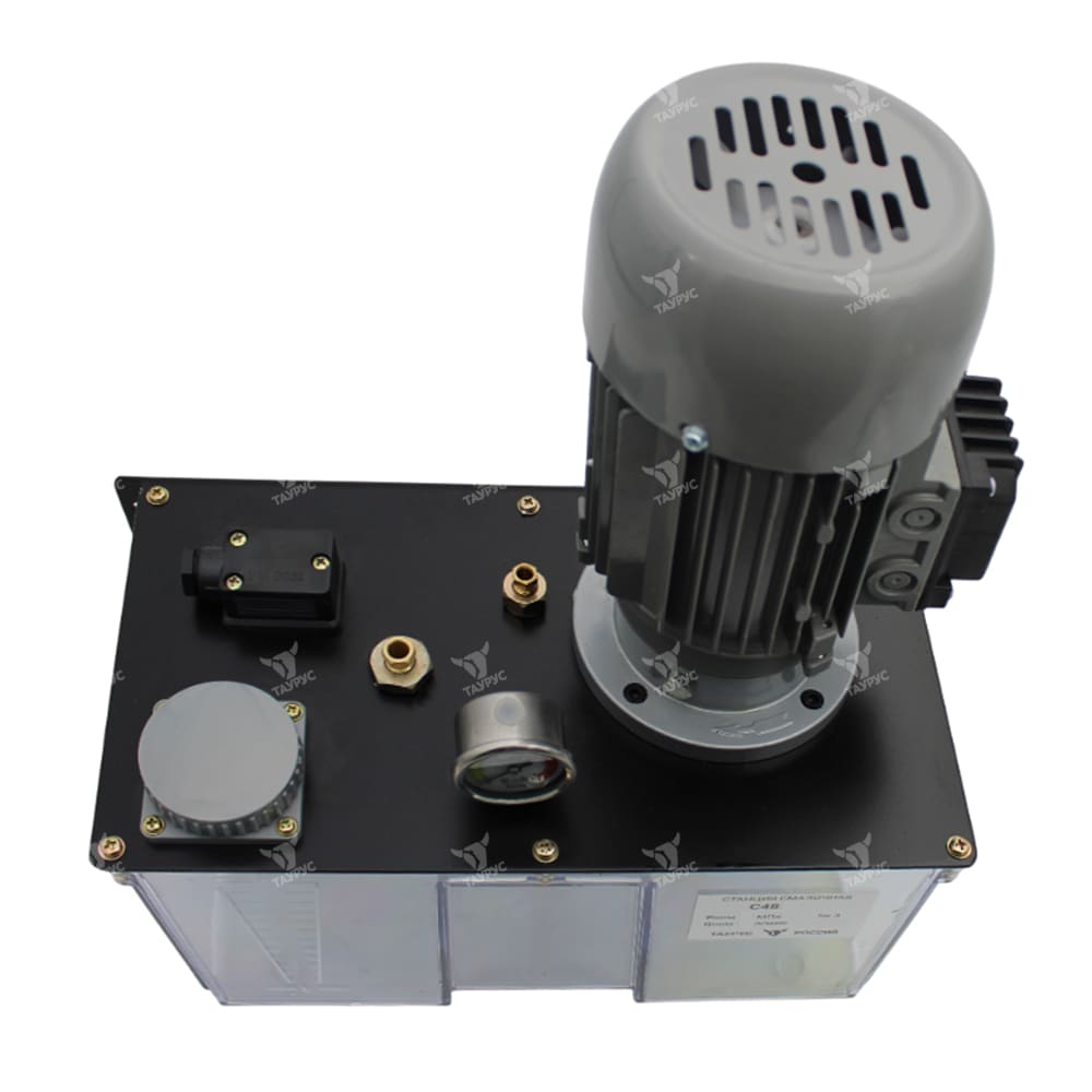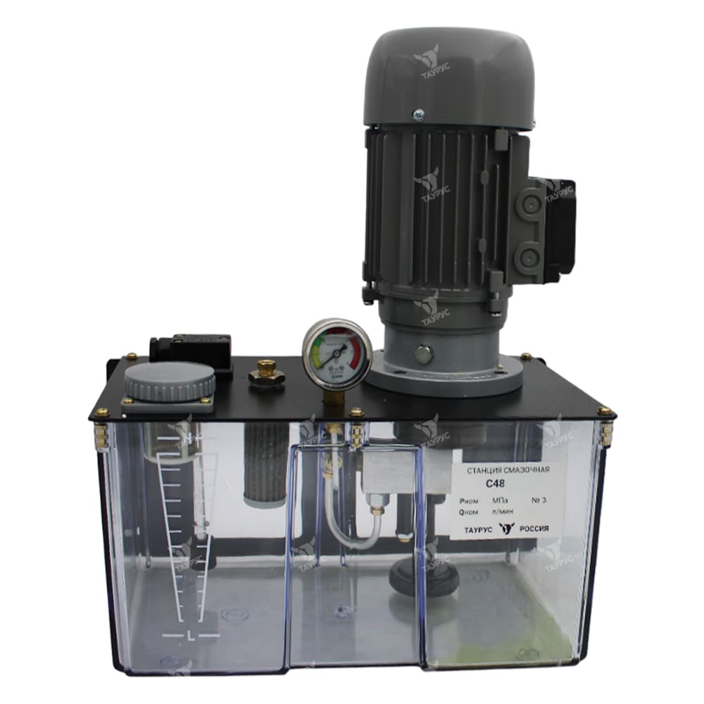 Смазочная станция типа С48-13М содержит насосную установку, выполненную на базе шестеренного насоса 1 (см. чертёж слева) с фланцевым электродвигателем 2, фильтр тонкой очистки 3 с предохранительным клапаном 4, установленным на напорной линии насоса; резервуар 5, снабженный пробкой 6 для слива смазочного материала и указателями уровня масла 7, заливной фильтр 8. Для заземления станции на электродвигателе предусмотрен болт заземления 9.