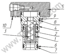 ![]() Гидроклапаны состоят из комплекта затвора и фланца. В комплект затвора входят: гильза 1, клапан 2, пружина 3 и переходная втулка 4. Комплект затвора вставляется в монтажное отверстие гидроблока и прижимается фланцем 5. Для уплотнения клапанов в монтажных отверстиях гидроблоков в гильзе имеются резиновые 6, 8 и защитные из термоэластопласта 7, 9 кольца. Для уплотнения каналов управления на торцовой поверхности фланца 5 имеются резиновые кольца 10. |