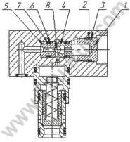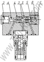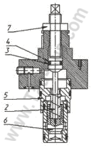 ![]() В исполнениях гидроуправляемых клапанов с ограничением хода запорного элемента во фланец 1 ввернут регулировочный винт 2, уплотнённый во фланце резиновым 3 и защитным из термоэластопласта 4 кольцами. Регулировочный винт, проходящий через переходную втулку 5, ограничивает ход клапана 6 при открытии. На винте имеется контргайка 7. |