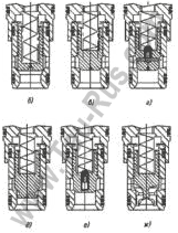 ![]() а) с соотношением надклапанной и подклапанной площадей 1,05:1; б) с демпфером и подводом управляющего потока с торца запорного элемента (соотношение надклапанной и подклапанной площадей 1,05:1); в) с соотношением надклапанной и подклапанной площадей 1,6:1; г) с демпфером и подводом управляющего потока сбоку запорного элемента (соотношение надклапанной и подклапанной площадей 1,6:1); д) с дросселирующей цапфой (соотношение надклапанной и подклапанной площадей 1,6:1); е) с демпфером и подводом управляющего потока с торца запорного элемента (соотношение надклапанной и подклапанной площадей 1,6:1); ж) с дросселирующим хвостовиком с треугольными пазами (соотношение надклапанной и подклапанной площадей 1,6:1). |