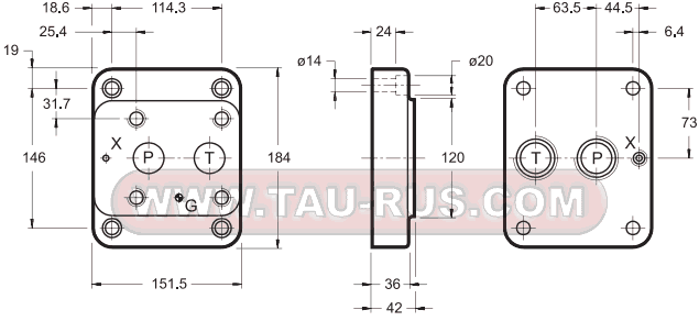 PMRQ5-AI5G/20 – Плита для клапана давления, CETOP R08, P = G1'', T = G1'', X = G1/4'', сзади, сталь;