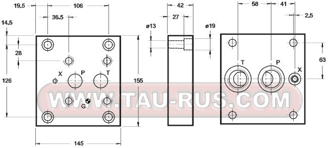 PMRQ3-AI4G/20 – Плита для клапана давления, CETOP R06, P=G1/2'', T=G3/4'', X=G1/4'', сзади;
